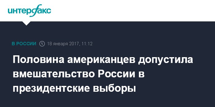 Москва. 18 января. INTERFAX.RU - Более половины (51%) американцев полагают, что Россия вмешивалась в президентские выборы в США в 2016 году посредством хакерских атак на серверы Демократической партии. Об этом свидетельствуют результаты опроса, проведенного американскими телеканалом NBC и газетой Wall Street Journal.