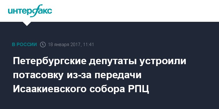 Москва. 18 января. INTERFAX.RU - Небольшая стычка произошла в среду между депутатами Законодательного собрания Петербурга на пленарном заседании после обсуждения вопроса о передаче Исаакиевского собора Русской православной церкви.
