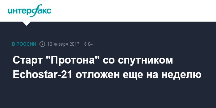 Москва. 18 января. INTERFAX.RU - Запуск ракеты-носителя "Протон" со спутником Echostar-21 с Байконура вновь перенесен, сообщил в среду "Интерфаксу" источник на космодроме.
