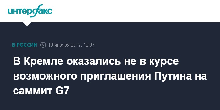 Москва. 19 января. INTERFAX.RU - Пресс-секретарь президента РФ Дмитрий Песков заявил, что в Кремле нет информации о возможном приглашении властями Италии президента РФ Владимира Путина на саммит "семерки", который пройдет 26-27 мая в итальянском городе Таормина.