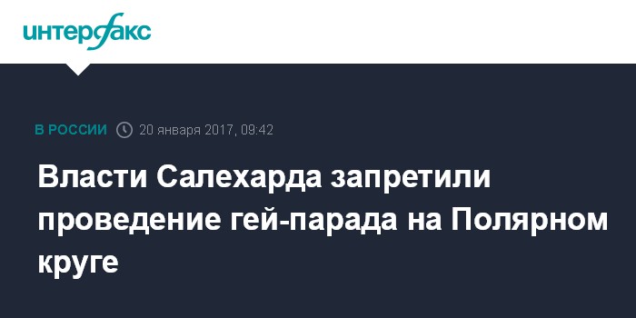 Москва. 20 января. INTERFAX.RU - ЛГБТ-активисты подали в администрацию Салехарда - города, расположенного на Полярном круге, уведомление о проведении двух митингов и одного шествия, но им направлен отказ, сообщили агентству "Интерфакс" в пресс-службе администрации города.