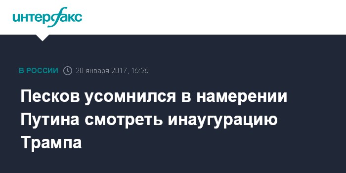 Москва. 20 января. INTERFAX.RU - Пресс-секретарь президента РФ Дмитрий Песков усомнился в том, что глава государства будет наблюдать церемонию инаугурации нового президента США Дональда Трампа в прямом эфире.