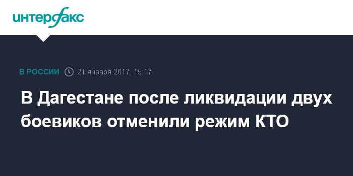 Москва. 21 января. INTERFAX.RU - Оперативный штаб снял специальный режим контртеррористической операции (КТО) в селе Вперед Кизлярского района Дагестана, сообщил в субботу "Интерфаксу" представитель оперативного штаба республики.