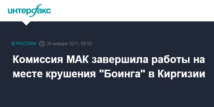Москва. 24 января. INTERFAX.RU - Представители Межгосударственного авиационного комитета закончили работу на месте крушения грузового "Боинга 747-400", потерпевшего крушение 16 января.