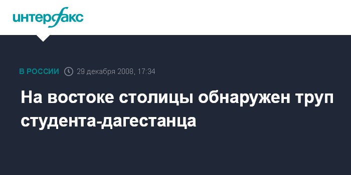 Москва. 29 декабря. INTERFAX.RU - Труп уроженца Дагестана - студента первого курса столичного вуза - найден на востоке Москвы, сообщил "Интерфаксу" источник в правоохранительных органах города в понедельник.