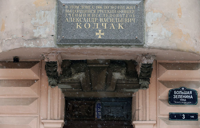 Доска памяти русского военачальника и одного из лидеров Белого движения в годы Гражданской войны в России Колчака была установлена 12 ноября 2016 года в Петербурге на доме 3 по улице Большая Зеленина. Инициатором ее установки был мемориально-просветительский и историко-культурный центр "Белое дело". Губернатор Петербурга Георгий Полтавченко утвердил установку доски.