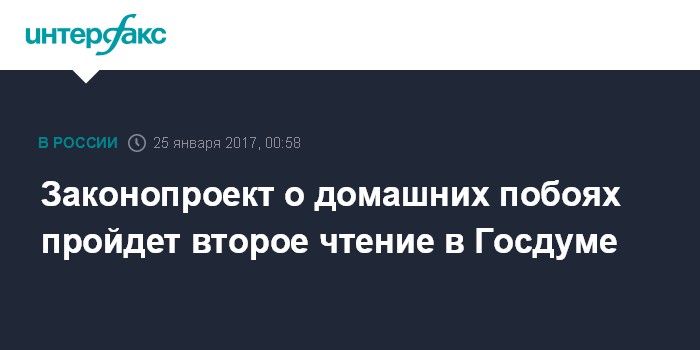 Москва. 25 января. INTERFAX.RU - Госдума на заседании в среду рассмотрит во втором чтении законопроект о переводе первого случая домашних побоев из разряда уголовных преступлений в разряд административных правонарушений, при этом второй и последующий случаи домашнего насилия предлагается оставить уголовными преступлениями.