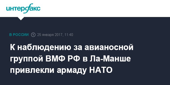 Москва. 25 января. INTERFAX.RU - Корабли авианосной ударной группы Северного флота, вошедшие накануне в Ла-Манш по пути на базу в Североморск, идут по проливу под плотным наблюдением целой корабельной армады НАТО, в составе которой есть даже вертолетоносец, свидетельствуют данные международной Автоматической идентификационной системы.