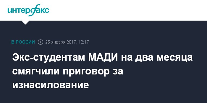 Москва. 25 января. INTERFAX.RU - Мосгорсуд смягчил приговор двум бывшим студентам Московского автомобильно-дорожного института (МАДИ) Льву Каменецкому и Станиславу Соболевскому, осужденным за изнасилование девушки, передает корреспондент "Интерфакса".