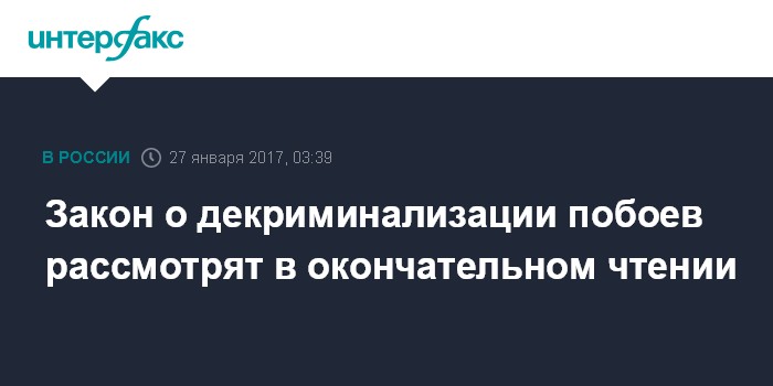 Москва. 27 января. INTERFAX.RU - Госдума на заседании в пятницу рассмотрит в третьем окончательном чтении законопроект о переводе первого случая домашних побоев из разряда уголовных преступлений в разряд административных правонарушений.