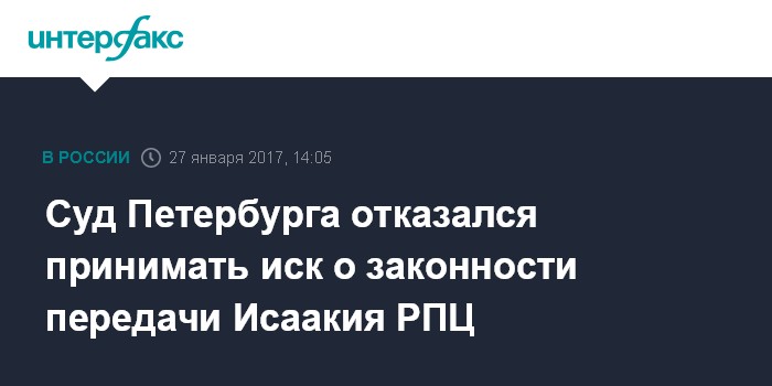 Москва. 27 января. INTERFAX.RU - Василеостровский районный суд не принял к рассмотрению иск о законности передачи Исаакиевского собора Русской православной церкви (РПЦ), сообщается на сайте суда. "Отказано в принятии административного искового заявления", - следует из материалов картотеки суда.