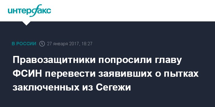 Москва. 27 января. INTERFAX.RU - Видные правозащитники просят главу Федеральной службы исполнения наказаний (ФСИН) России перевести заключенных карельских колоний, сообщивших, подобно активисту Ильдару Дадину, о применяемых к ним пытках, в следственный изолятор Петрозаводска.