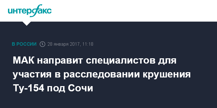 Москва. 28 января. INTERFAX.RU - Специалисты Межгосударственного авиационного комитета (МАК) примут участие в расследовании крушения военного Ту-154 под Сочи, сообщил "Интерфаксу" представитель комитета.