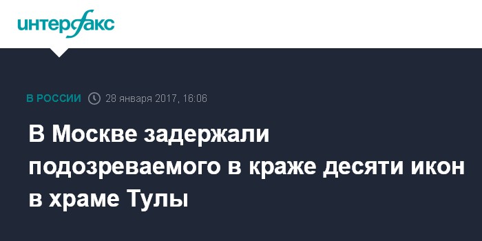 Москва. 28 января. INTERFAX.RU - Сотрудниками полиции в Москве задержан подозреваемый в краже старинных икон из храма в поселке Петелино Тулы, сообщила "Интерфаксу" официальный представитель МВД России Ирина Волк.