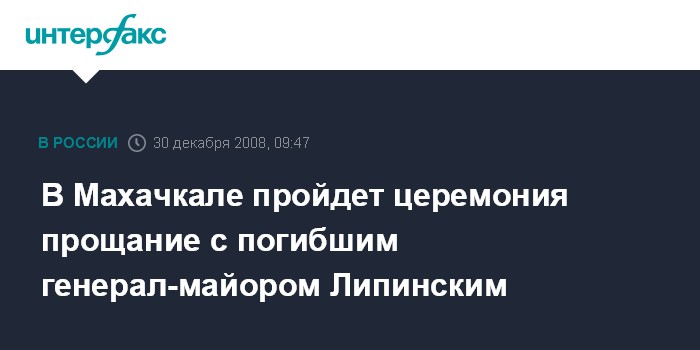 "Планируется, что прощание с генерал-майором Валерием Липинским пройдет на базе ГРОУ по республике Дагестан. Группой оперативного управления генерал-майор Липинский руководил около полутора лет", - сообщили агентству "Интерфакс-Юг" во вторник в штабе соединения внутренних войск МВД РФ.