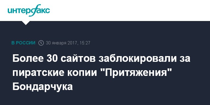 Москва. 30 января. INTERFAX.RU - Роскомнадзор заблокировал несколько десятков сайтов, распространяющих пиратские копии фильма Федора Бордарчука "Притяжение", сообщается на сайте ведомства в понедельник.