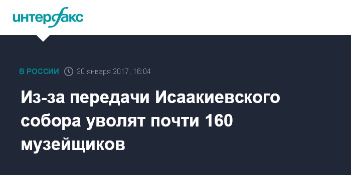 Москва. 30 января. INTERFAX.RU - Почти 160 сотрудников государственного музея-памятника (ГМП) "Исаакиевский собор" лишатся работы в случае передачи объекта в управление РПЦ, сообщил в интервью "Интерфаксу" директор учреждения Николай Буров.