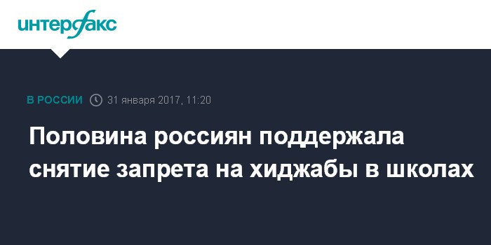 Как показал телефонный опрос, проведенный 28-29 января среди 1200 жителей РФ, каждый второй (50%) поддерживает отмену запрета на ношение данных головных уборов, чтобы дети из мусульманских семей могли спокойно учиться.
