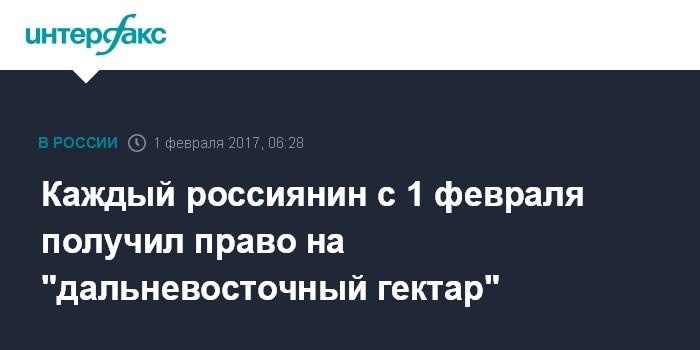Москва. 1 февраля. INTERFAX.RU - Любой гражданин РФ с 1 февраля сможет получить в безвозмездное пользование "дальневосточный гектар", который, как считают в Минвостокразвития, является одним из эффективных инструментов, чтобы привлечь на Дальний Восток людей из других регионов страны.
