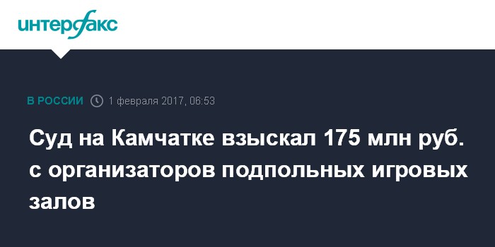 Москва. 1 февраля. INTERFAX.RU - Суд на Камчатке взыскал в пользу казны почти 175 млн руб. с осужденных фигурантов дела о незаконной организации азартных игр, среди которых - экс-начальник управления экономической безопасности и противодействия коррупции краевого управления МВД, сообщила в среду пресс-служба прокуратуры Камчатского края.