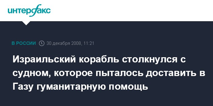 Москва. 30 декабря. INTERFAX.RU - Корабль израильских ВМС не пропустил в сектор Газа судно с грузом гуманитарной помощи, зафрахтованного активистами Движения за освобождение Газы.