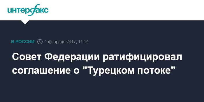 Москва. 1 февраля. INTERFAX.RU - Совет Федерации в среду ратифицировал соглашение с Турцией по проекту газопровода "Турецкий поток".