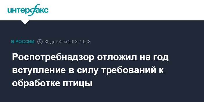 Согласно опубликованному на официальном сайте Роспотребнадзора постановлению главного государственного санитарного врача РФ Геннадия Онищенко "Об использовании для обработки тушек птицы растворов, содержащих хлор", срок вступления в действие пункта 1.1 постановления "О производстве и обороте мяса птицы" перенесен на 1 января 2010 года. Постановление подписано 4 декабря 2008 года.