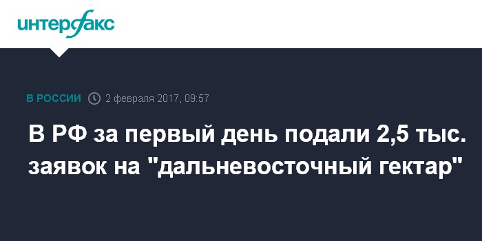 Москва. 2 февраля. INTERFAX.RU - Россияне в среду 1 февраля, когда началось действие третьего этапа закона о "дальневосточном гектаре", который позволяет всем россиянам получить участок в этом регионе, подали 2,5 тысячи заявок, сообщила пресс-служба Минвостокразвития.