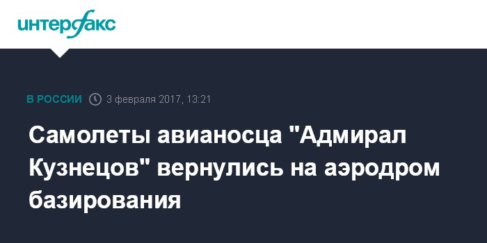 "Самолеты и вертолеты палубной авиации Су-33, МиГ-29К, Ка-52, Ка-29 и Ка-27 выполнили перелет с находящегося в Баренцевом море тяжелого авианесущего крейсера "Адмирал Флота Советского Союза Кузнецов" на аэродром базирования в Мурманской области после успешного выполнения поставленных задач в Сирийской Арабской Республике", - сказано в сообщении пресс-службы СФ.