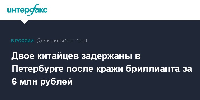 Москва. 4 февраля. INTERFAX.RU - Полицейские задержали в Петербурге двух граждан Китая, подозреваемых в краже бриллианта со стенда в выставочном центре "Экспофорум", сообщил "Интерфаксу" источник в правоохранительных органах в субботу.