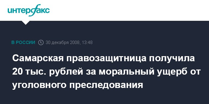 "Министерство финансов России выплатило самарской правозащитнице Л.Кузьминой 20 тыс. рублей за необоснованное уголовное преследование", - сообщила во вторник межрегиональная правозащитная организация "Агора".