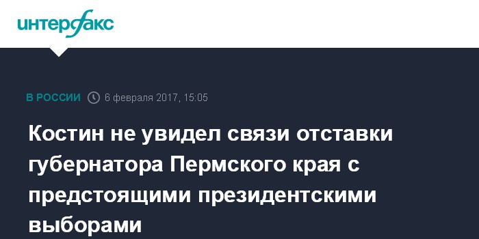 Отвечая на вопрос о связи замены главы Пермского края и других возможных кадровых перестановок в губернаторском корпусе с предстоящими президентскими выборами, Костин сказал: "Я бы все-таки не связывал эту ротацию губернаторского корпуса с политическим календарем, потому, что есть важная задача - повышение качества госуправления, в первую очередь, на региональном уровне. Ротация губернаторов, совершенствование законодательства в этой сфере имеет своей целью ровно это - повышение качества жизни людей, более быстрого решения имеющихся проблем".