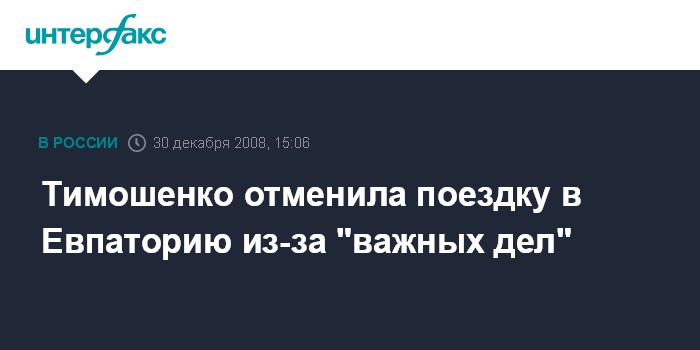Москва. 30 декабря. INTERFAX.RU - Премьер-министр Украины Юлия Тимошенко отменила поездку в Евпаторию во вторник.