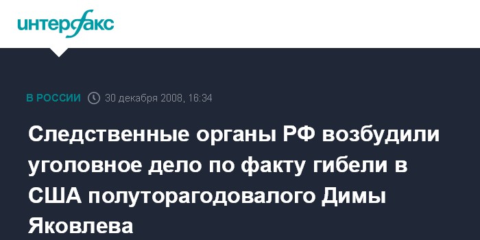 Москва. 30 декабря. INTERFAX.RU - Главное следственное управление СКП РФ возбудило уголовное дело по факту гибели в США полуторагодовалого Димы Яковлева, сообщил "Интерфаксу" во вторник официальный представитель СКП РФ Владимир Маркин.