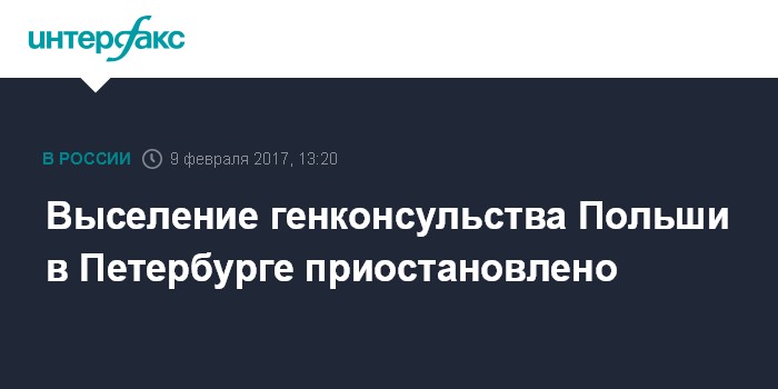 Москва. 9 февраля. INTERFAX.RU - Выселение генерального консульства Польши из зданий в центре Санкт-Петербурга, инициированное по решению суда за многомиллионные долги, официально приостановлено, сообщил "Интерфаксу" представитель МИД РФ в Петербурге Владимир Запевалов.
