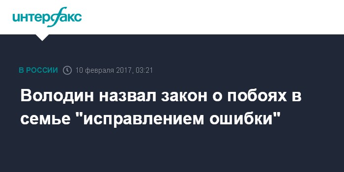 Москва. 10 февраля. INTERFAX.RU - Спикер нижней палаты российского парламента Вячеслав Володин заявил в опубликованном в пятницу интервью "Коммерсанту", что за побои, связанные с насилием в семье, раньше было предусмотрено наказание более жесткое, чем это необходимо.