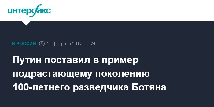 "Такие люди, как Вы, по праву являются гордостью России, и очень важно, чтобы Ваша ответственная гражданская позиция, искренняя сопричастность к судьбе Отечества были примером для подрастающего поколения", - говорится в телеграмме. В послании президент пожелал Ботяну здоровья, бодрости духа и всего самого доброго. Из своих 100 лет Ботян полвека служил в разведке.