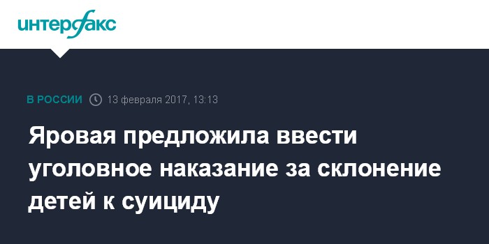 Москва. 13 февраля. INTERFAX.RU - В Госдуме подготовлен законопроект о введении уголовной ответственности за склонение ребенка к самоубийству, сообщила вице-спикер нижней палаты Ирина Яровая на совещании в ГД.