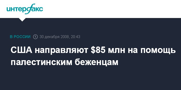 Москва. 30 декабря. INTERFAX.RU - США объявили о решении выделить $85 млн структурам Организации Объединенных Наций для оказания гуманитарной помощи палестинским беженцам, сообщил во вторник госдепартамент США.