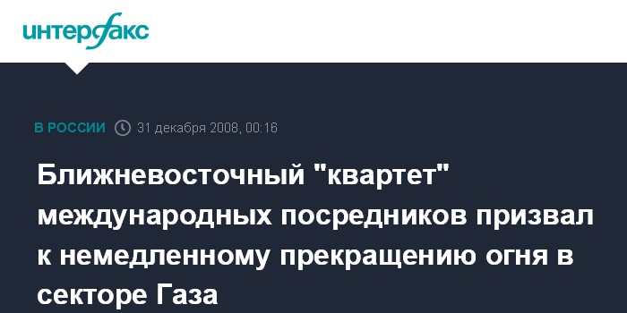 Москва. 31 декабря. ИНТЕРФАКС - "Квартет" посредников по урегулированию израильско-палестинского конфликта призвал немедленно прекратить кровопролитье в секторе Газа.