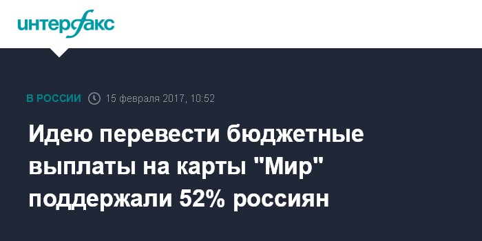 Москва. 15 февраля. INTERFAX.RU - Идею о переводе бюджетных выплат на карты "Мир" поддерживают более половины россиян (52%), не одобряют эту меру 34%, сообщает ВЦИОМ.