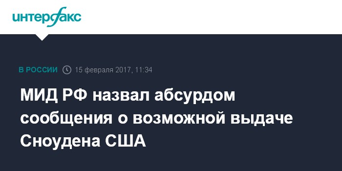 Москва. 15 февраля. INTERFAX.RU - В МИД РФ назвали абсурдными сообщения СМИ о возможной выдаче США экс-сотрудника ЦРУ Эдварда Сноудена в качестве "подарка" для нового президента Дональда Трампа.