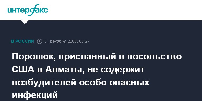Астана. 31 декабря. INTERFAX.RU - Специалисты Казахского научного центра зоонозных и карантинных инфекций им.Айкимбаева проводят экспертизу порошка, присланного в конверте для представительства посольства США в Алматы (Алма-Ата), сообщило в среду МЧС Казахстана.
