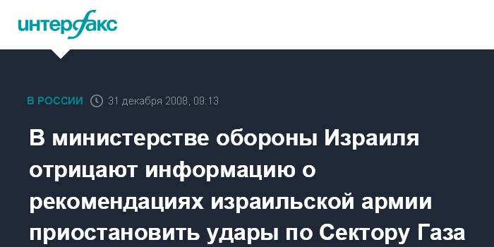 Москва. 31 декабря. INTERFAX.RU - Официальные представители министерства обороны Израиля отрицают появившиеся во вторник вечером слухи о том, что командование армии обороны Израиля рекомендовало премьер-министру Эхуду Ольмерту приостановить военные действия сроком на 48 часов для изучения возможных вариантов прекращения огня и решения конфликта в секторе Газы, сообщает интернет-сайт израильской газеты "Джерузалем пост".