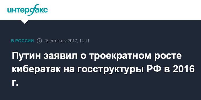 Москва. 16 февраля. INTERFAX.RU - Число кибератак на ресурсы официальных российских структур в минувшем году выросло в три раза, сообщил президент РФ Владимир Путин на коллегии ФСБ в четверг.