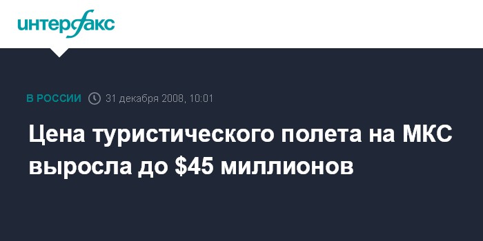 Москва. 31 декабря. INTERFAX.RU - Стоимость полета космического туриста к Международной космической станции (МКС) и десятидневного пребывания на ней увеличилась до $35-45 млн, сообщает сайт компании "Спейс Эдвенчерс".