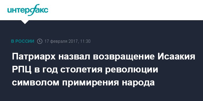 Москва. 17 февраля. INTERFAX.RU - Патриарх Московский и всея Руси Кирилл назвал возвращение Исаакиевского собора Русской православной церкви в год столетия революции важным для примирения народа.