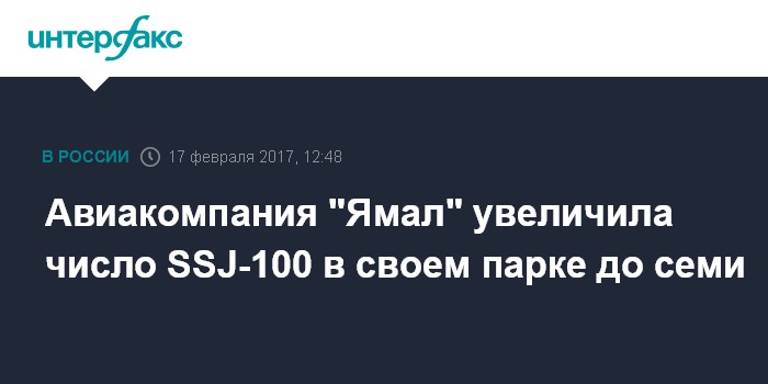 Москва. 17 февраля. INTERFAX.RU - АО "Авиационная транспортная компания "Ямал" увеличило парк самолетов Sukhoi Superjet 100 (SSJ-100) с трех до семи, сообщили "Интерфаксу" в пресс-службе авиакомпании.
