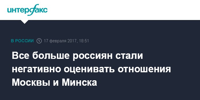 Москва. 17 февраля. INTERFAX.RU - За последние полтора года снизилась доля россиян, положительно оценивающих отношения между РФ и Белоруссией и видящих стремление Минска к сближению с Москвой, сообщает фонд "Общественное мнение". О том, что отношения плохие, сказали 22% россиян, хотя еще полтора года назад так считали лишь 6%.