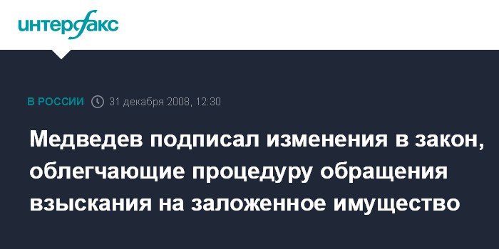 Москва. 31 декабря. INTERFAX.RU - Президент России Дмитрий Медведев подписал Федеральный закон "О внесении изменений в некоторые законодательные акты Российской Федерации в связи с совершенствованием порядка обращения взыскания на заложенное имущество".